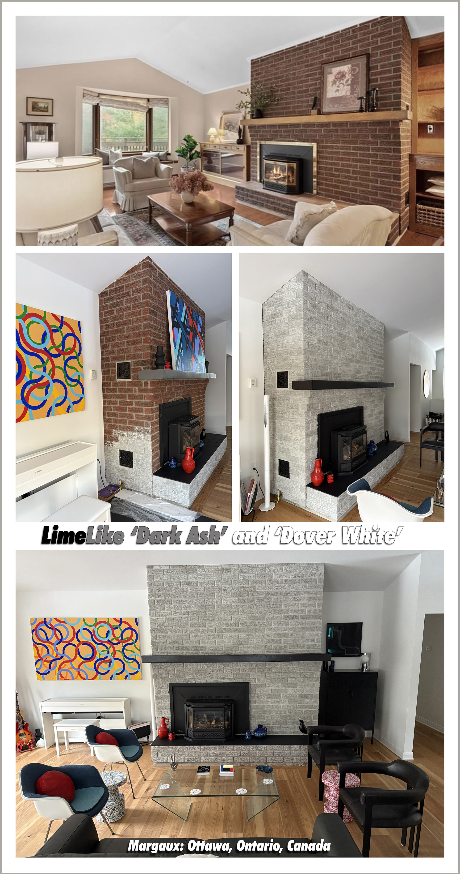 "After an intense search for a product to update my tired old red brick fireplace, I finally came upon Limelike and Dyebrick. I was sold when I saw the video where your product completely covered the old red brick, yet still allowed them to breathe! I used the same products that were used in the video, starting with Limelike Fossil Grey on the entire area and then painting shades of Dyebrick Charcoal on the bricks. Using a natural sponge roller, the last coat was Limelike Dover White that added the highlights. I smiled the entire time while applying it, totally loving the look! The final touch was to add Caledonia granite on the hearth. I could not be happier with the final look! Thank you so much! Your products are fantastic!!